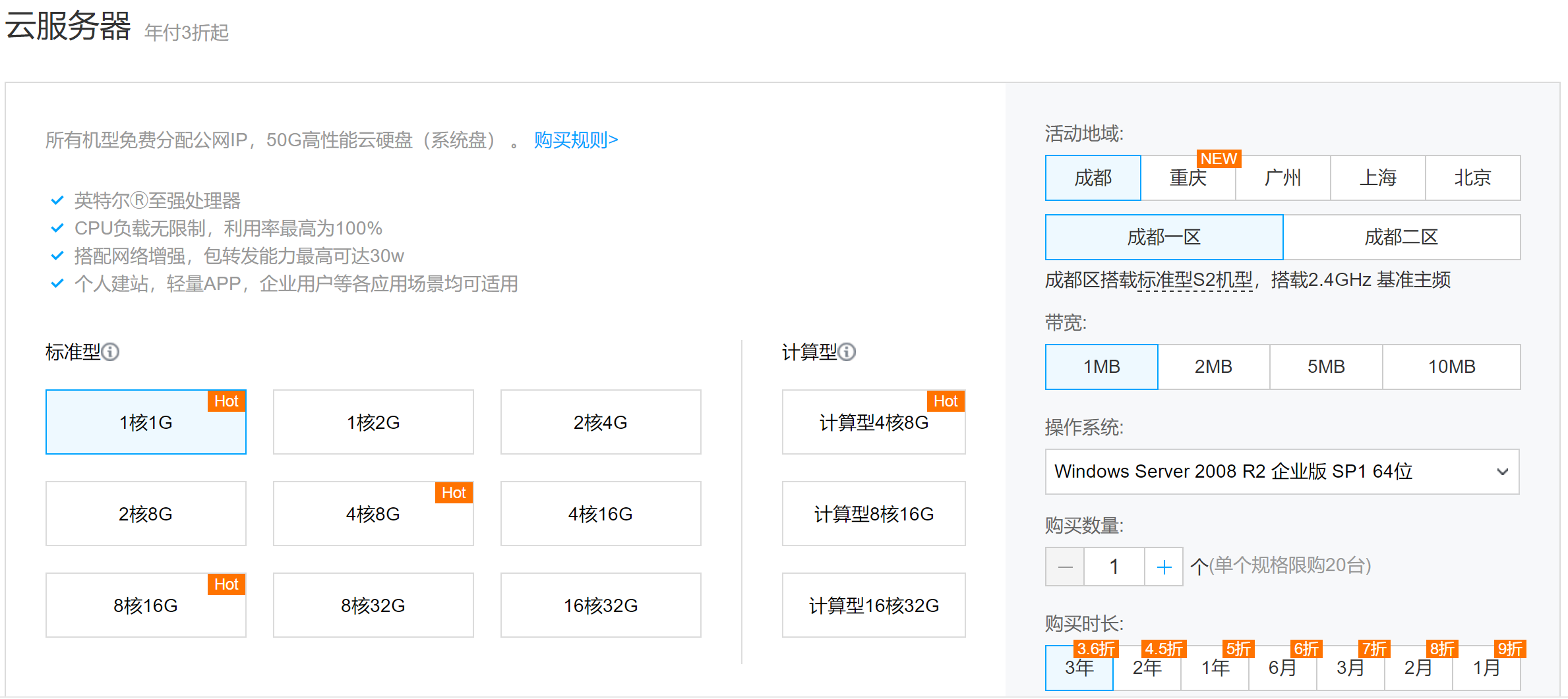 我们可以根据自己需要的项目选择对应的配置方案,入门配置方案是1核CPU1G内存,后续如果不够用我们可以随时进行升级,也可以根据当前实际的项目进行选择较高的配置。如果觉得默认的配置方案不符合我们的要求,我们还可以根据自己的需求选择自定义配置。