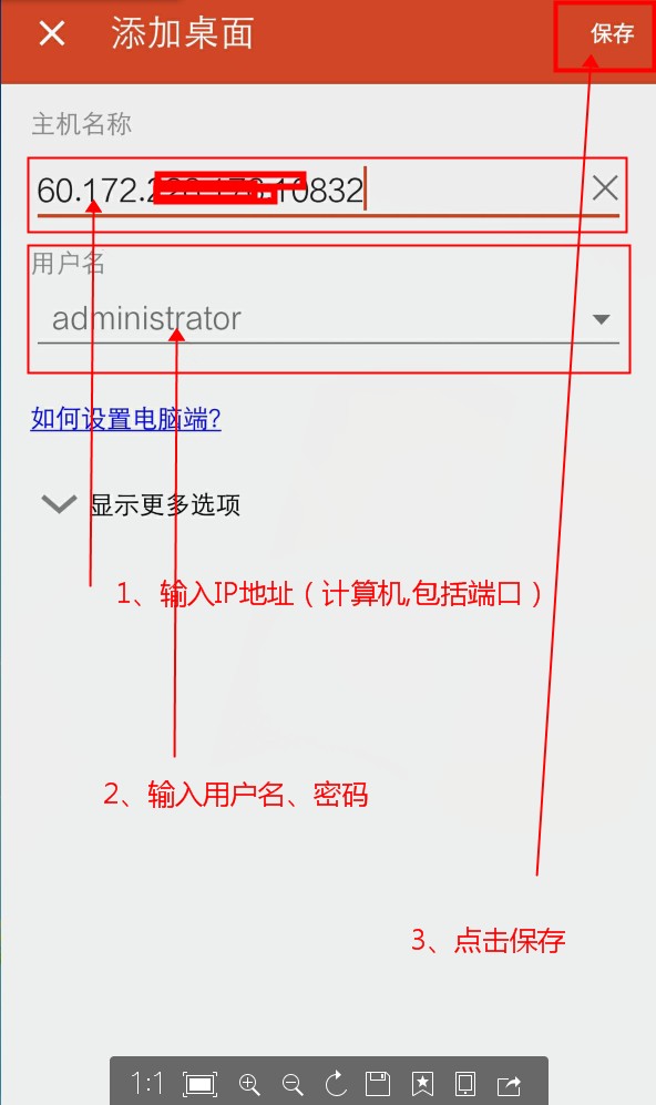 3、输入远程连接信息(连接IP,用户名、密码),并点击保存,如下图